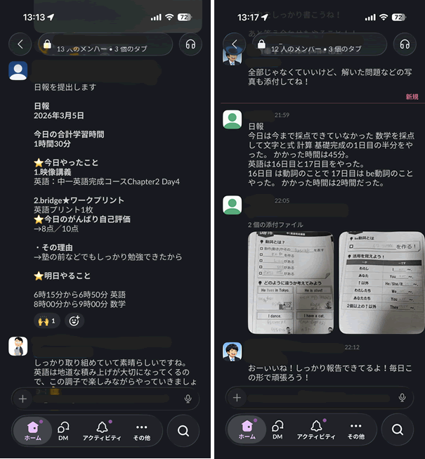 Slackチャンネルに保護者も参加可能です。提出状況やフィードバック内容を共有することで、お子さまの学習状況を一緒に把握できます。またSlackチャンネルでお子様に「ちゃんと出しなさい」などの指示をいただくことはOKです。なお原則保護者の方の学習相談は、Slackチャンネルで承ることは致しかねます。